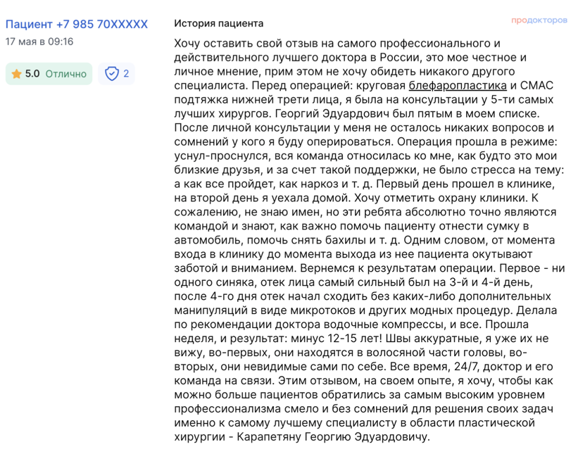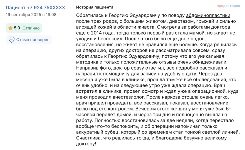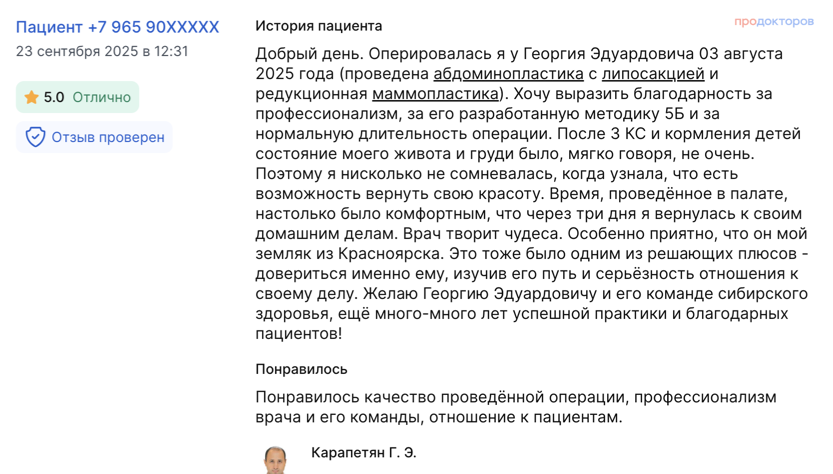 «Изменения уже видны – я ложусь, а у меня нет дряблого живота. У меня прекрасное настроение. Знаю, что с каждым днем всё будет лучше и лучше. Отеки сойдут – и я красотка))» «Я советую только этого доктора. Если вы хотите, чтобы у вас все было бесшовно, бескровно, бесследно, то, пожалуйста, к Карапетяну Георгию Эдуардовичу, больше ни к кому»