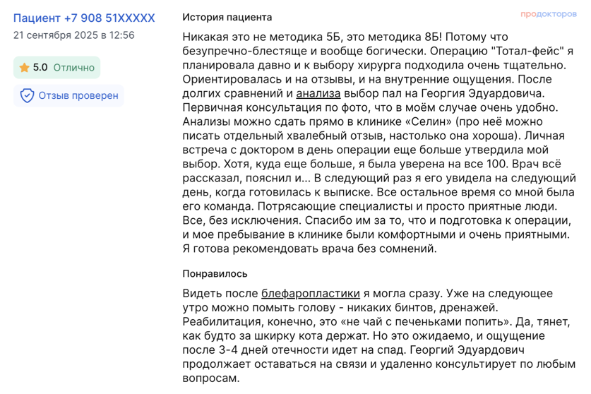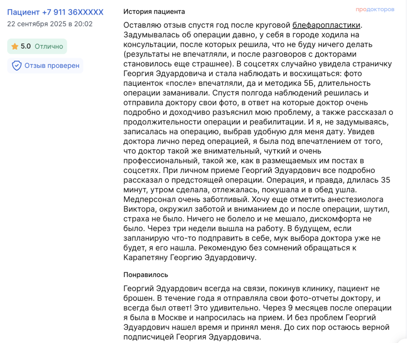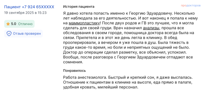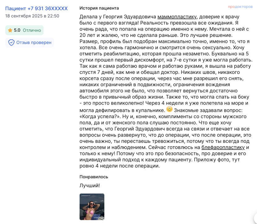 «О Георгии Эдуардовиче я узнала от подруги. Она приезжала к нему на две операции и отзывалась о нем очень хорошо. Прям порекомендовала мне обратиться именно к нему»